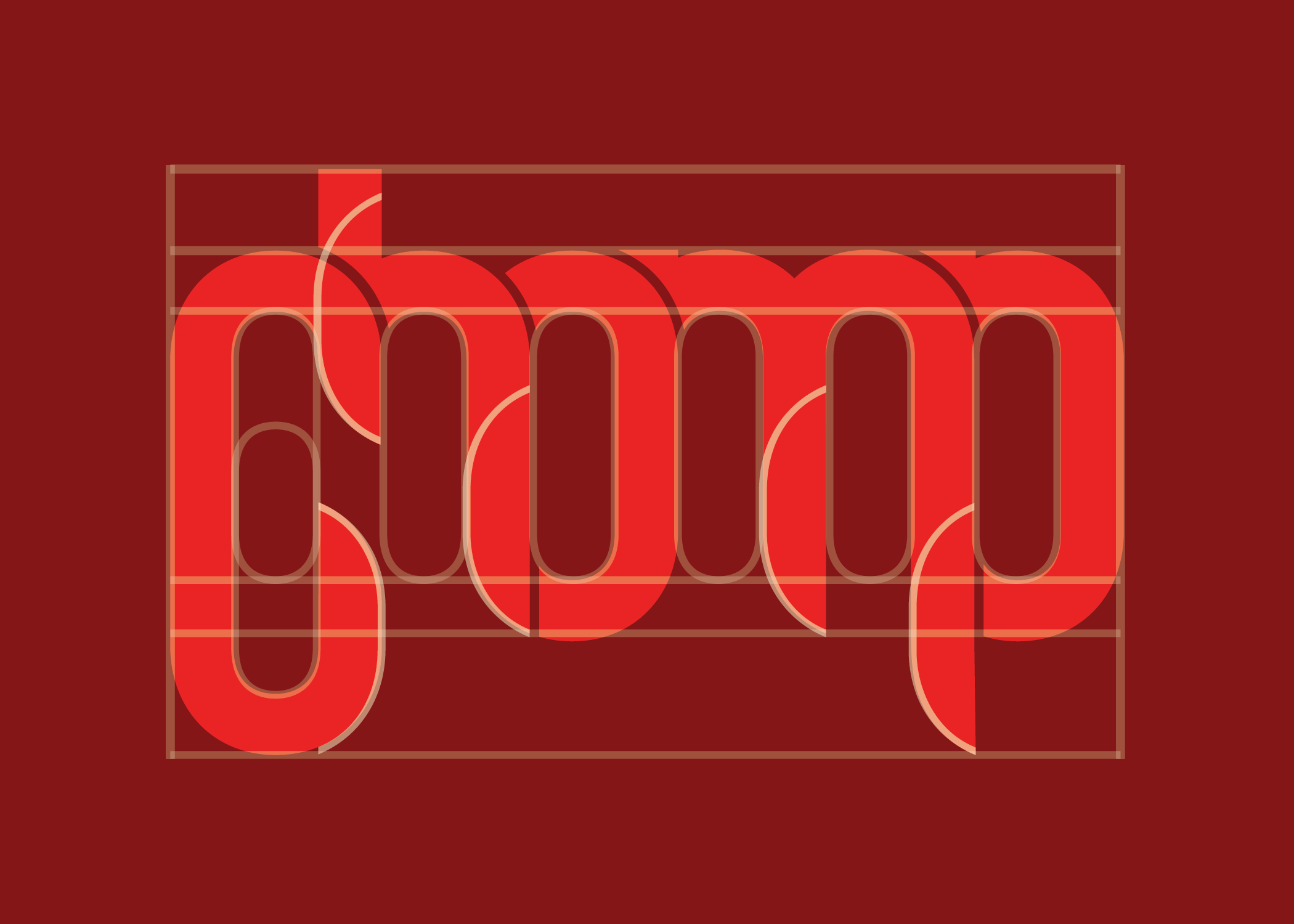 Animated GIF displaying the underlying structure of the final wordmark. A recurring oval shape is used to maintain consistency in the letters. Descenders and stems of the letters have sharp edges, making the wordmark aggressive and impactful.