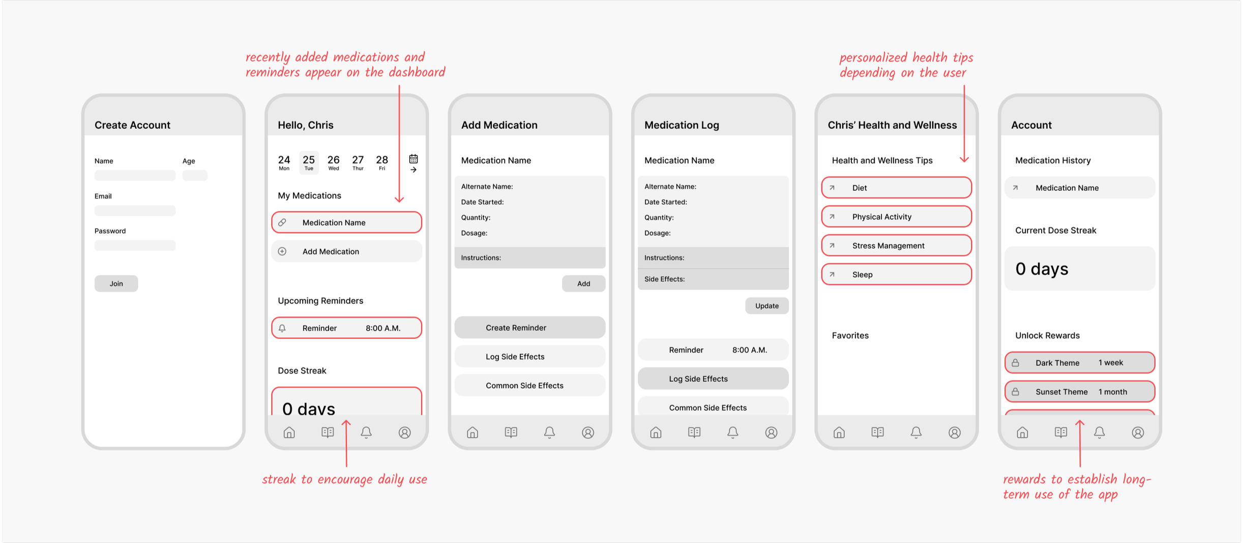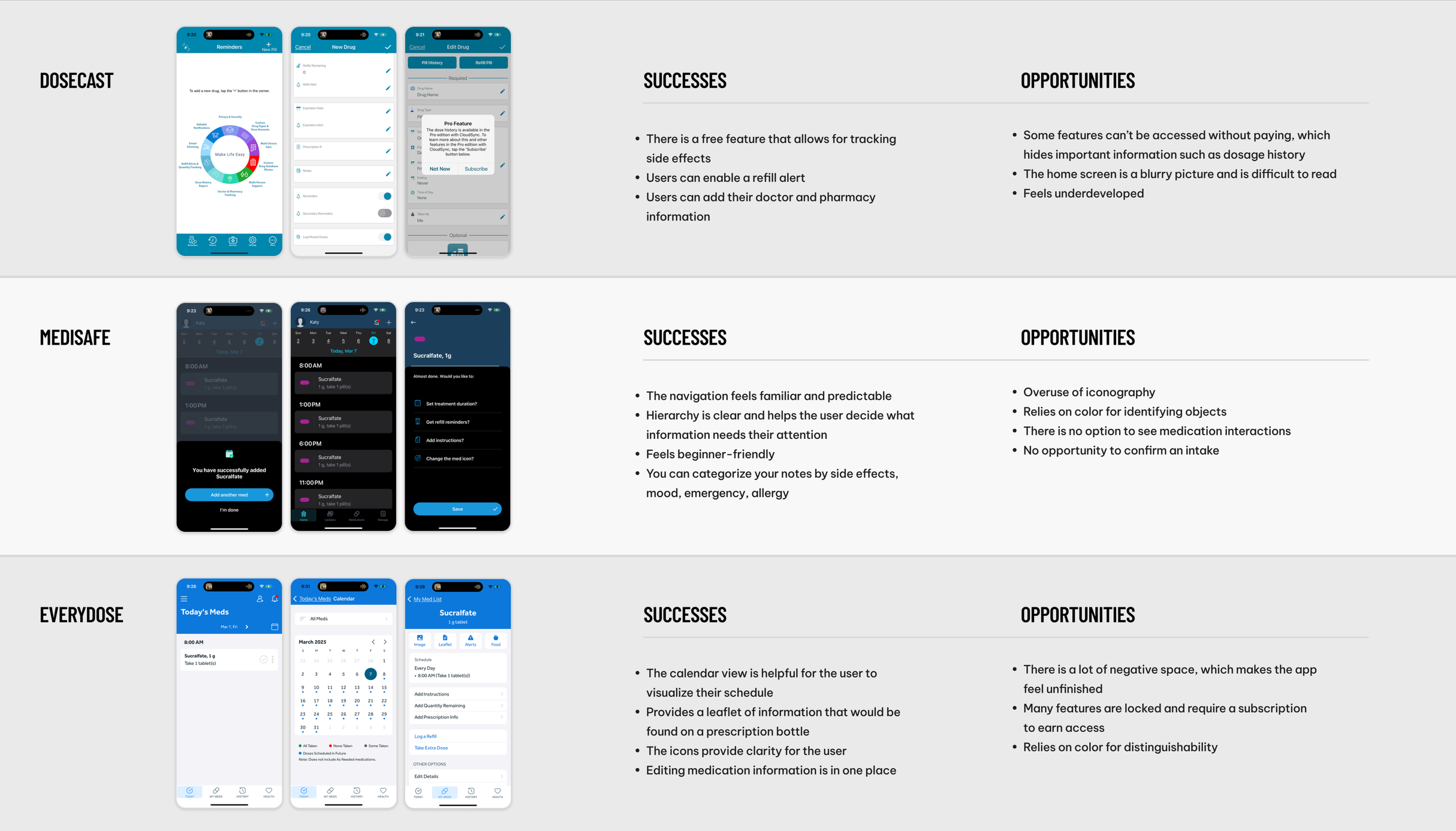 Dose provides information about a user’s medication so that it is readily available. Users are reminded to take their medication, track their side effects, and are encouraged to learn and incorporate healthy habits into their life. Users establish a routine of taking medication, thereby feeling in control of their health and wellbeing.